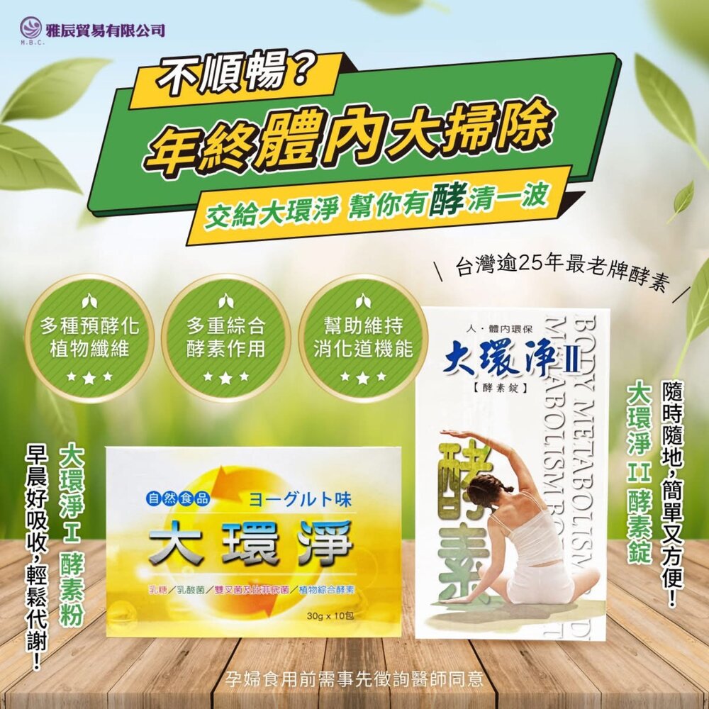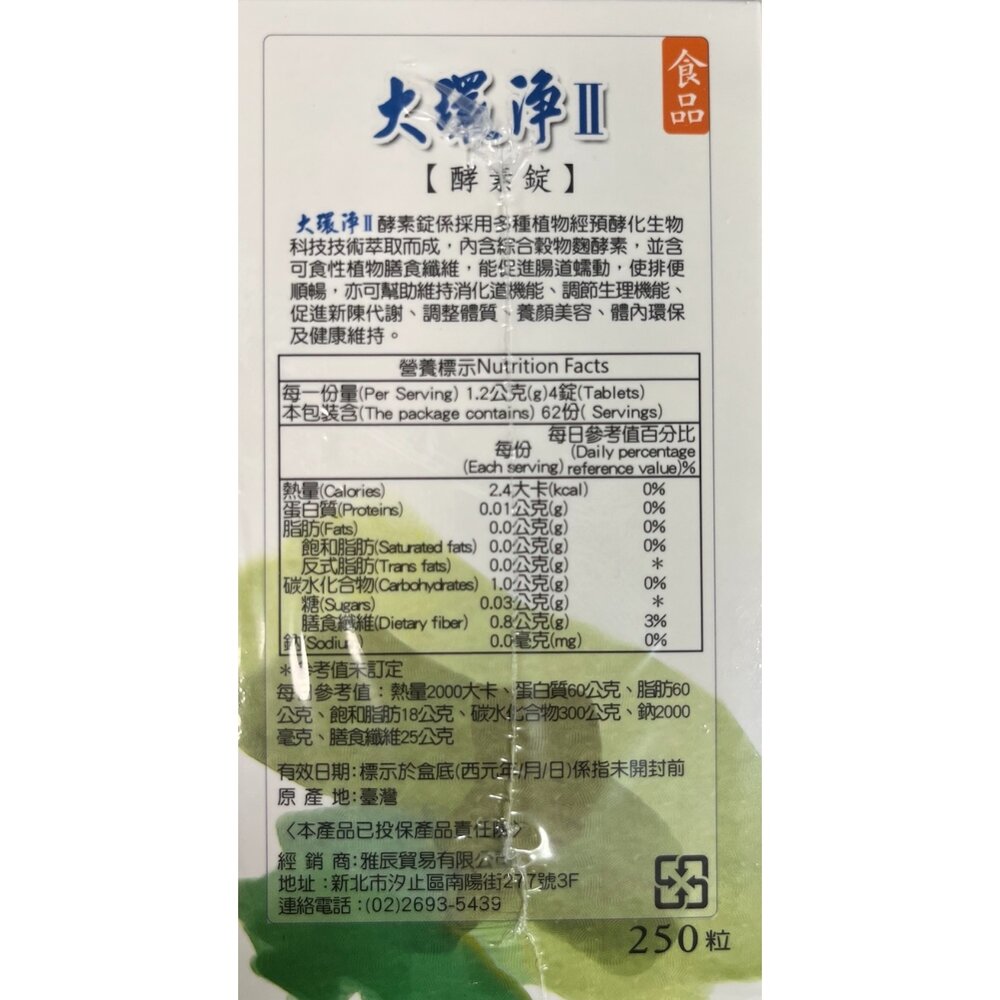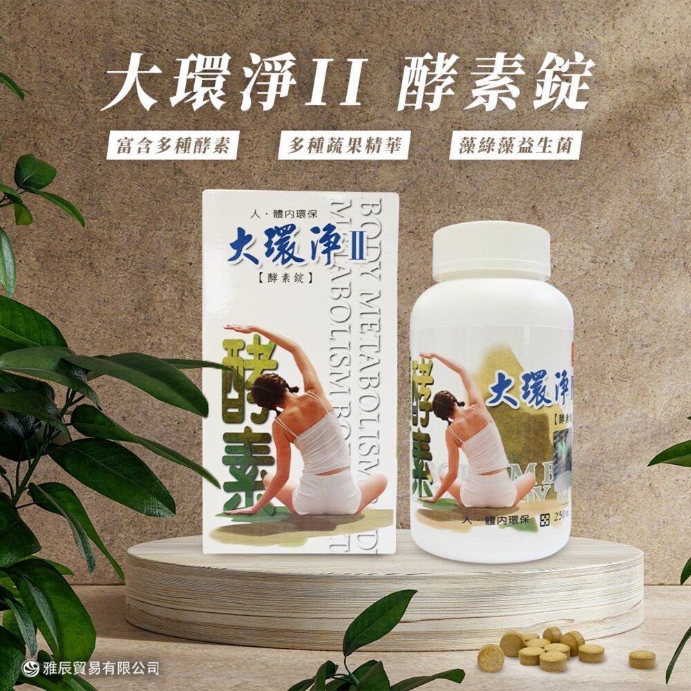 大環淨II酵素錠 是業界酵素錠始祖推手,早於28年前就因為觀察到國內所有年齡層都因為忙碌或者不重視飲食,而。當時,台灣並沒有類似產品,日本對於酵素卻是已經非常成熟,我們只能從日本進口酵素粉加上台灣的益生菌與天然蔬果,期待可以幫助維持消化道機能,調整生理機能、促進新陳代謝。這是第二代酵素產品,因為第一代粉狀較為麻煩,根據多數使用者建議,我們催生出台灣第一的酵素錠,也吸引許多業者與消費者愛戴宣傳。但是,我們一再強調酵素只能當成補充品,身體還是要依賴新鮮有機蔬果的營養,以及正確的生活習慣及放鬆慢慢吃飯、均衡飲食,才能達到樂活人生!!許多身體發出警訊與問題,其實都是源於只進不出的現象